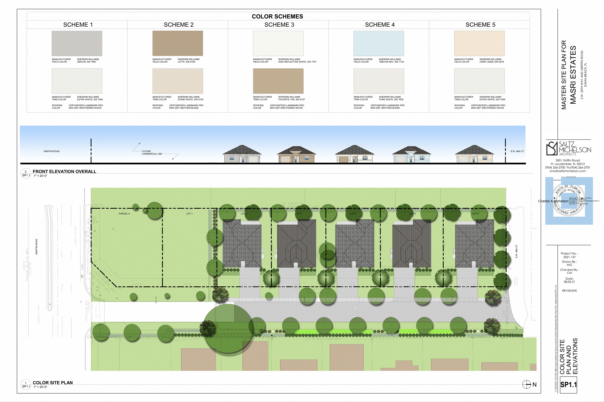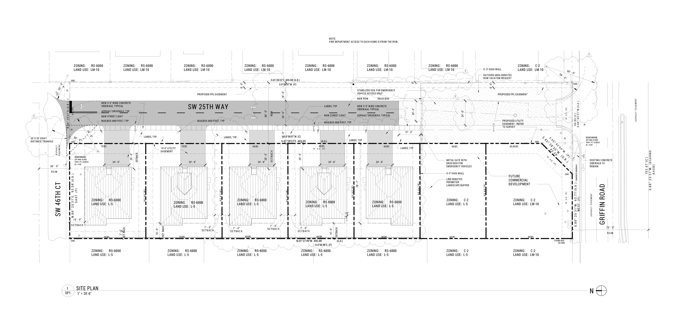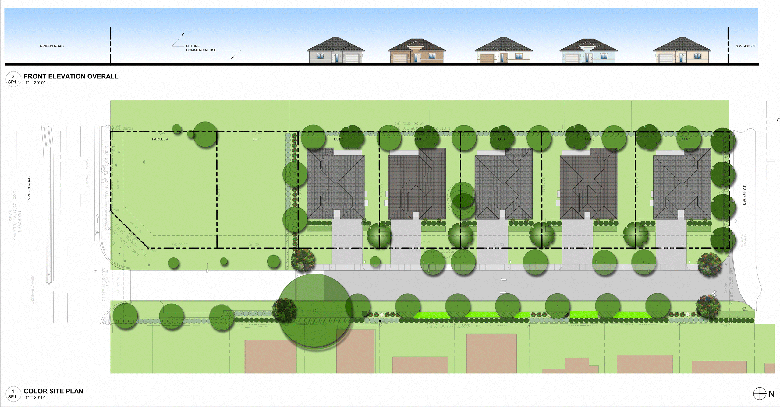 The sale consists of 7 lots in a row, two parcels with C-2 zoning, a Community Business District allowing many uses, and 100 feet of exposure to Griffin Rd. The remaining five lots are residential, zoned RS-6000, and have a significant advantage of a 100 % approved project by the city. This project allows for the construction of 5 single-family homes, with one house offering a spacious 2000 square feet and a garage. All necessary documents, including surveys, site plans, and civil plans, are readily available, streamlining the development process for potential buyers.